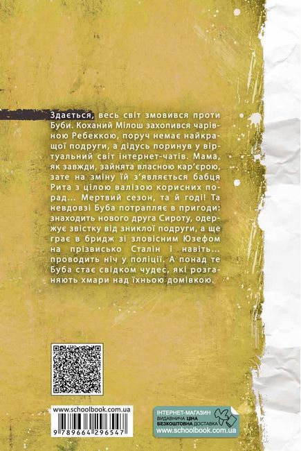 Здається, весь світ змовився проти Буби. Коханий Мілош захопився чарівною Ребеккою, поруч немає найкращої подруги, а дідусь поринув у віртуальний світ інтернет-чатів. Мама, як завжди, зайнята власною кар’єрою, зате на зміну їй з’являється бабця Рита з цілою валізою корисних порад… Мертвий сезон, та й годі! Та невдовзі Буба потрапляє в пригоди: знаходить нового друга Сироту, одержує звістку від зниклої подруги, а ще грає в бридж зі зловісним Юзефом на прізвисько Сталін і навіть… проводить ніч у поліції. А понад те Буба стає свідком чудес, які розганяють хмари над їхньою домівкою.