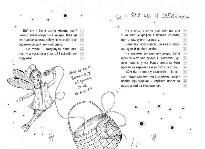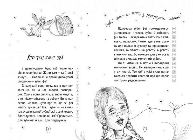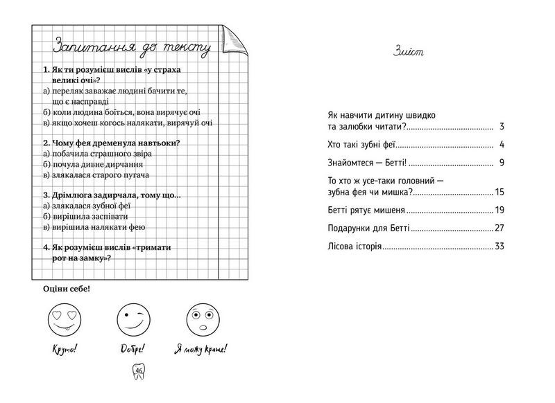 А що ти скажеш, якщо, прочитавши лише кілька сторінок «Оповідок зубної феї», ти вже значно покращиш техніку читання?! У цій книжці літери великі, а рядки короткі; тексту мало, зате повно малюнків, які можна розфарбовувати! Хіба не ідеальна книжка для тебе?«Оповідки зубної феї» — це короткі, але дуже цікаві історії від найталановитішої в світі чарівниці! Наприкінці кожної історії — запитання, відповівши на які, ти отримаєш від мами (чи того, хто вчить тебе читати) заслужене #оце–молодець! Числа наприкінці рядочків — це кількість прочитаних тобою слів. Тож дорослі можуть швидко порахувати, скільки слів ти читаєш за хвилину. Кілька спроб — і он як ти вже тарабаниш! І зауваж — ніякої магії! Ну хіба зовсім трішки, адже оповідачка — справжня фея!..