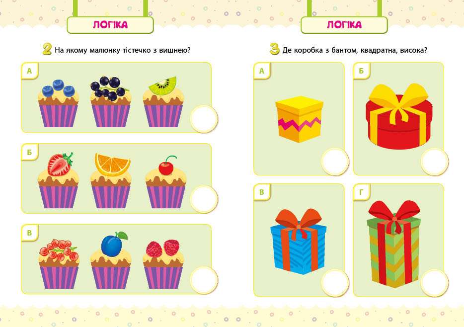 Запитання кожного розділу укладені відповідно до програм дошкільного розвитку та вікових особливостей дитини. Переглянувши варіанти відповідей, малюк має обрати один і позначити його наліпкою. Проходження таких тестів в ігровій формі зумовить поступове звикання до них й змалечку підготує дитину до тестової форми перевірки знань у майбутньому.