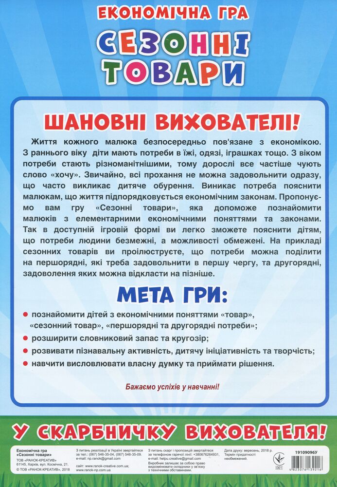 Формат: 31х21,5 см. Економічна гра «Сезонні товари» допоможе познайомити дітей з елементарними економічними поняттями і законами. Так в доступній ігровій формі ви легко зможете пояснити дітям, що потреби людини безмежні, а можливості обмежені. На прикладі сезонних товарів ви проілюструємо, що потреби можна розділити на першорядні, які треба задовольнити в першу чергу, і другорядні, задоволення яких можна відкласти на потім.