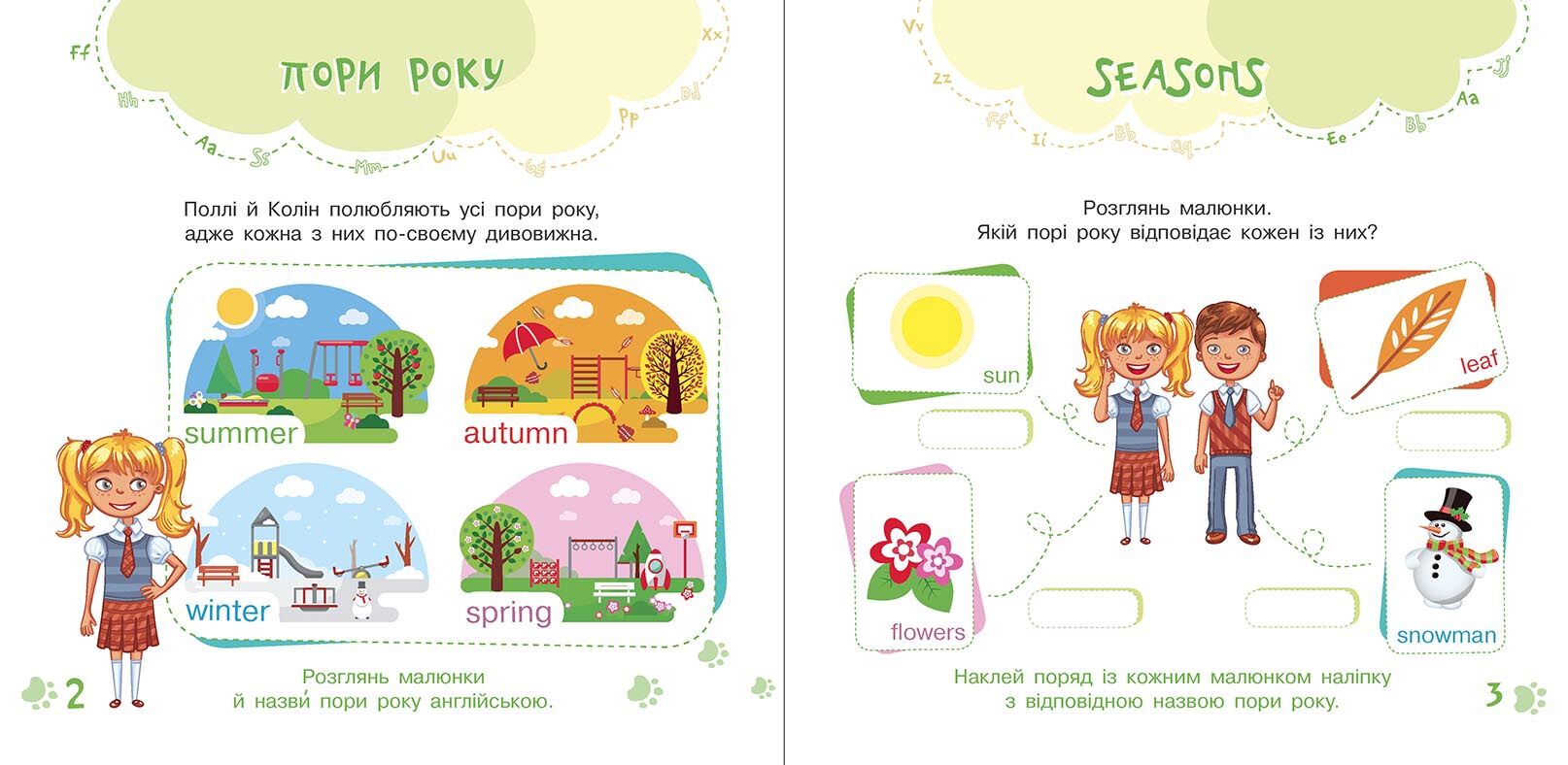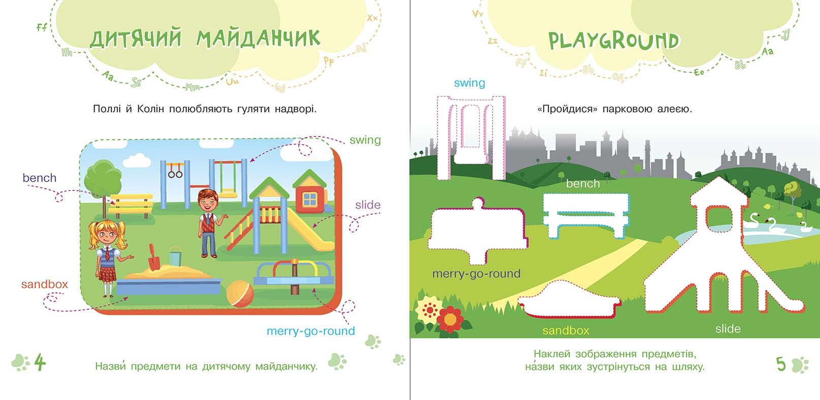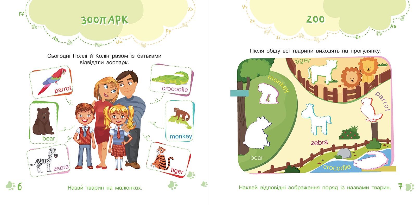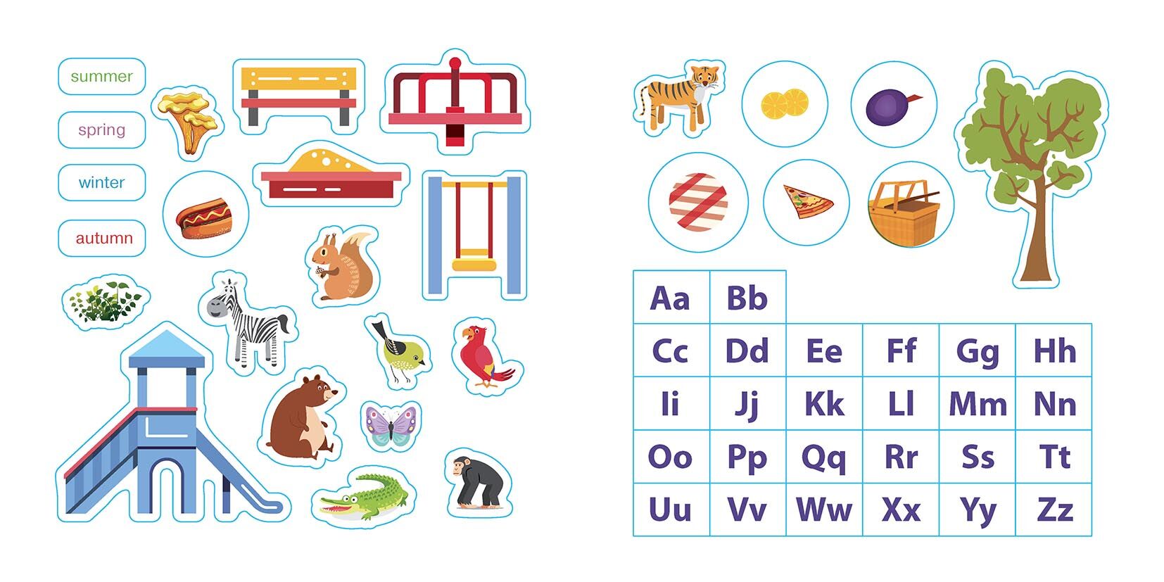 З серією книг «Англійська в наклейках» нудне запам'ятовування іноземних слів перетвориться в цікаву і продуктивну гру. Розглядайте з дитиною сюжетні картинки і читайте разом англійські слова. Потім «відпрацьовуйте» лексику, заповнюючи відсутні місця стікерами. В кінці книги батьки знайдуть словничок з перекладом і транскрипцією вивчених слів..