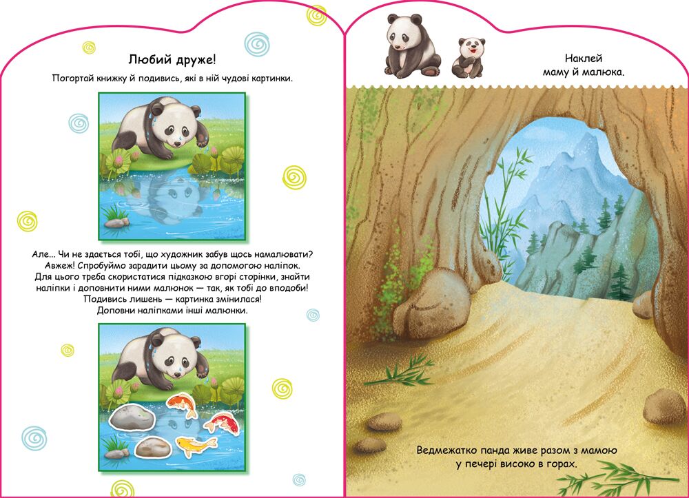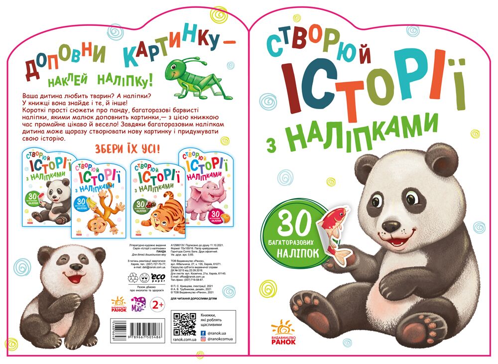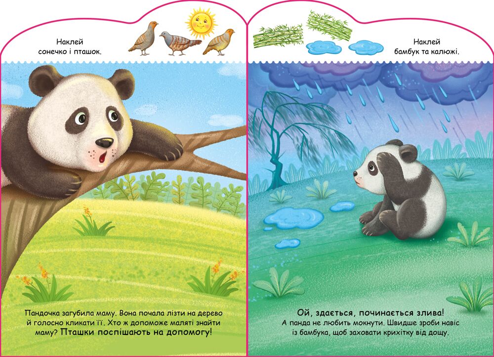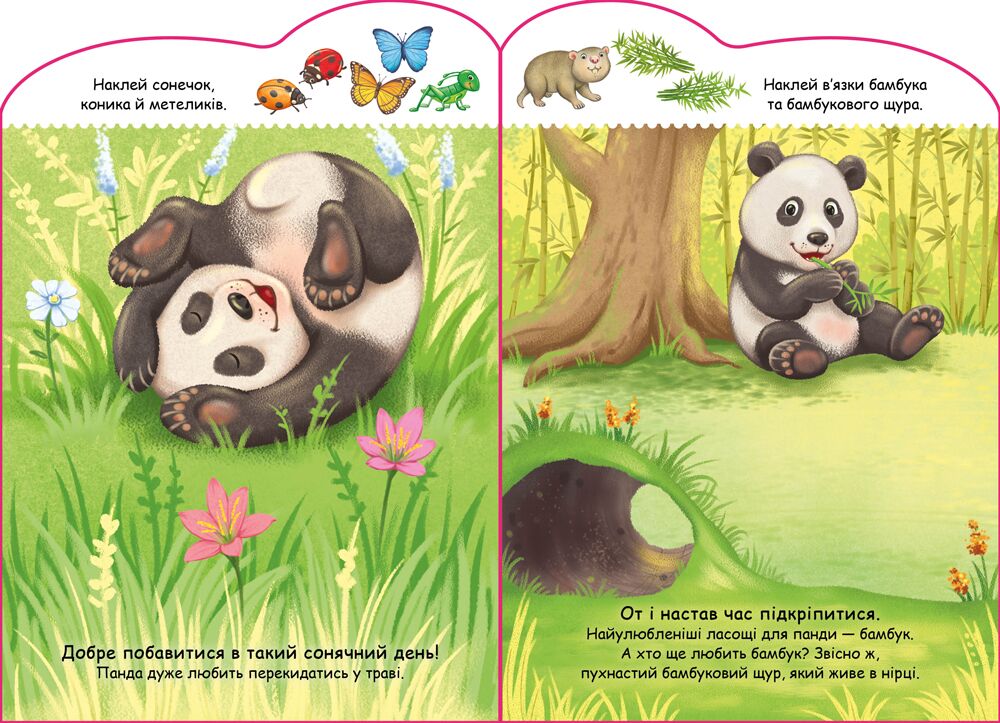 Ваша дитина любить тварин? А наліпки? У книжці вона знайде і те, й інше! Короткі прості сюжети про панду, великі барвисті наліпки, якими малюк доповнить картинки, — з цією книжкою час промайне цікаво й весело! Завдяки багаторазовим наліпкам дитина може щоразу створювати нову картинку і придумувати свою історію.