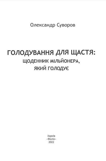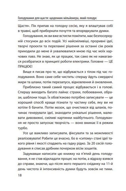 Олександр Суворов – успішний підприємець, засновник компанії Pet Technologies, який присвятив бізнесу тридцять років. Останні сім з них він двічі, а то й чотири рази на рік практикує десятиденне голодування і, як наслідок, помічає якісні зміни і в бізнесі, і в особистому житті. «Десятиденне профілактичне голодування – природний і найефективніший спосіб почистити тіло й мізки, розкрити творчий потенціал, урівноважити свій стан, почути голос інтуїції, відрізнити правду від брехні» – впевнений автор. Голодування – не тільки фізична, а й потужна духовна практика, яка доступна майже кожному. У книжці-щоденнику Суворов ділиться з читачем покроковими рекомендаціями, як правильно підготуватися до голодування, якісно прожити кожний голодний день, а потім правильно виходити з цього стану з максимальним позитивним ефектом для фізичного й ментального здоров’я. Текст доповнений коментарями людей, які практикують голодування за системою автора книжки, і власним досвідом доводять її ефективність.