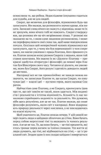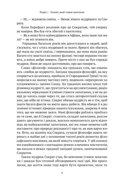 Він поведе вас хронологічною стежкою основних ідей в історії філософії. На цьому шляху є 40 зупинок — 40 коротких розділів. Ви вчитиметеся майстерності ставити запитання у стилі Сократа, піддавати думки скептицизму, як Піррон, розуміти Канта й розрізняти відтінки рожевих лінз, якими ми дивимося на світ. А ще довідаєтеся про погляди К’єркеґора й Дарвіна, Камю й Маркса чи ж як праці Ніцше «схвалив» Третій Райх, а Алан Тюрінг винайшов тест для штучного інтелекту.