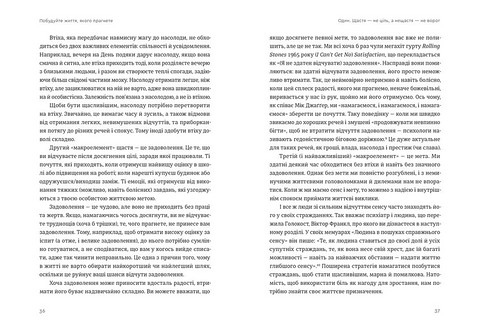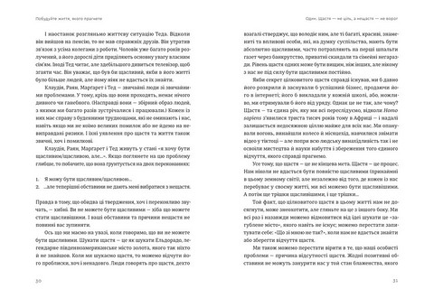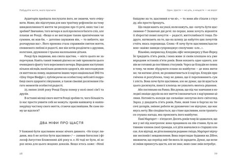 Чи можливо стати і залишатися щасливими? Як це зробити, якщо більшість життєвих проблем ми не здатні розв’язати так швидко й ефективно, як хотіли б? Професор Артур Брукс, що веде університетський курс зі щастя, разом зі співавторкою, знаною телеведучою Опрою Вінфрі, досліджують у цій книжці актуальні для всіх часів питання. Ця книжка не про силу волі, а про силу розривання патернів і змінювання звичок. Ви дізнаєтеся про основні мікроелементи щастя: втіху, задоволення і мету. Зрозумієте, що є щастям і нещастям саме для вас. Отримаєте конкретні поради щодо того, як обрати найкращу роботу, як знаходити друзів і підтримувати дружні стосунки, як у цьому буремному світі знайти собі пару і як розвивати духовну складову вашого життя. А головне — як на певному етапі життя стати вчителем для інших.