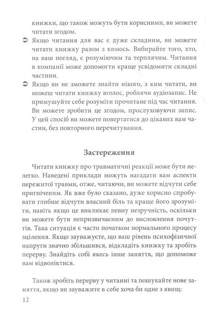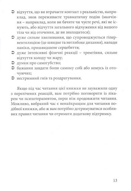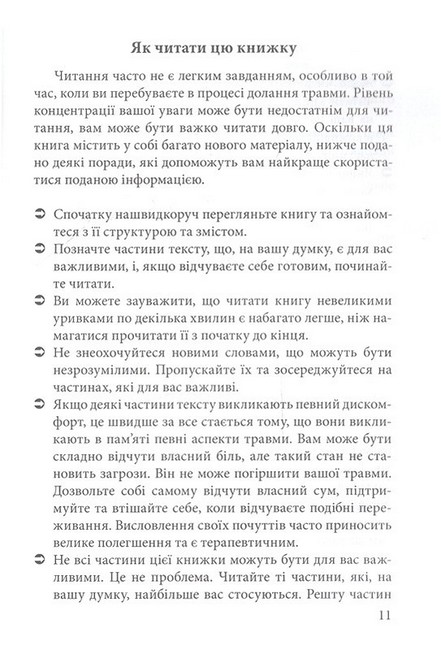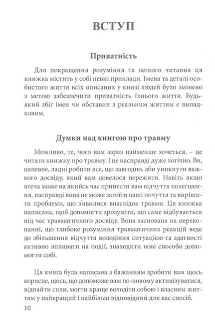 Психологічна травма є складним досвідом, що проявляється різними способами. Авторка, спираючись на свій багатолітній психотерапевтичний досвід, обґрунтовано, просто і з неймовірною пошаною до людських переживань розповідає читачеві, що саме відбувається під час травми та що потрібно робити, аби зцілитися від наслідків травматичних подій. Книга стане корисним посібником для осіб, що пережили травматичний досвід, а також для їхніх близьких та широкого кола зацікавлених читачів.