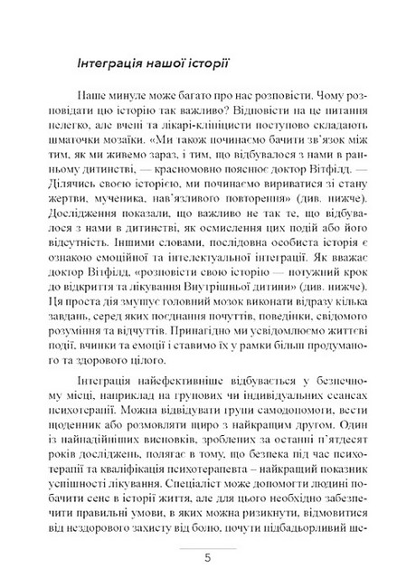 Перше видання найавторитетнішої книги про Внутрішню дитину українською мовою. Ця частина особистості є у кожного, і в багатьох вона травмована. Лікар-психотерапевт Чарльз Вітфілд буквально за руку веде читача до одужання — через оплакування своїх прихованих ран з минулого, вирішення внутрішніх конфліктів та глибинних проблем до прийняття себе та душевного благополуччя.
