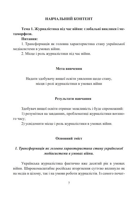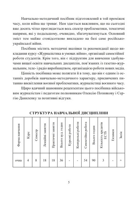 Посібник містить теоретичні відомості та контрольні запитання практично по всьому спектру навчальної дисципліни «Журналістика в умовах війни», завдання для організації самостійної роботи здобувачів, методичні вказівки та рекомендації щодо викладання курсу. Видання є одним із перших доробків навчально-методичного характеру, присвячених сучасній воєнній проблематиці, вітчизняній журналістиці в умовах широкомасштабного вторгнення військ РФ на територію України.