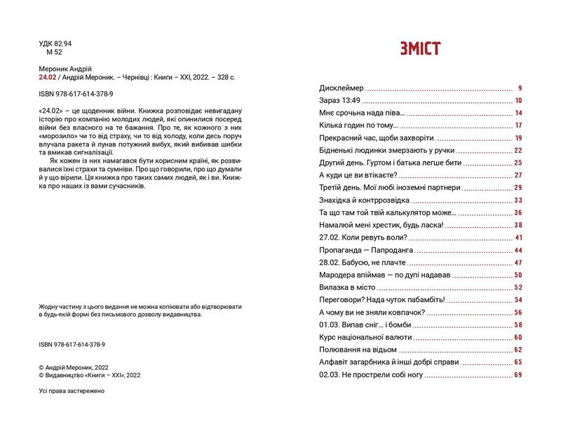 «24.02» – це щоденник війни. Книжка розповідає невигадану історію про компанію молодих людей, які опинилися посеред війни без власного на те бажання. Про те, як кожного з них «морозило» чи то від страху, чи то від холоду, коли десь поруч влучала ракета й лунав потужний вибух, який вибивав шибки та вмикав сигналізації.