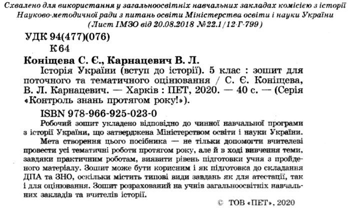 Історія України 5 клас Вступ до історії Зошит для поточного та тематичного оцінювання Коніщева С. ПЕТ.