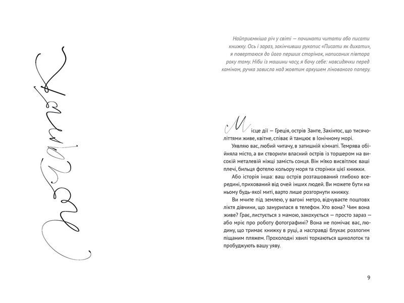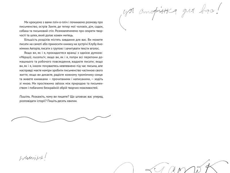 «Писати як дихати. 62 дні творчої свободи» — книжка для роботи, відпочинку і натхнення. Тут ви знайдете прості, мудрі, легковтілювані ідеї та поради, які стануть частиною вашого життя і повсякденної письменницької практики.