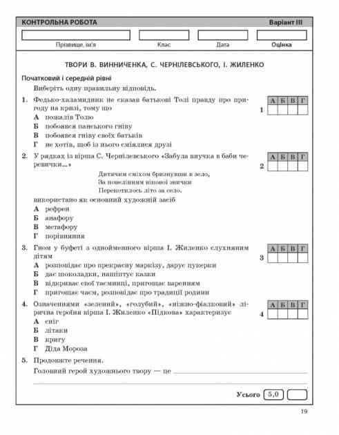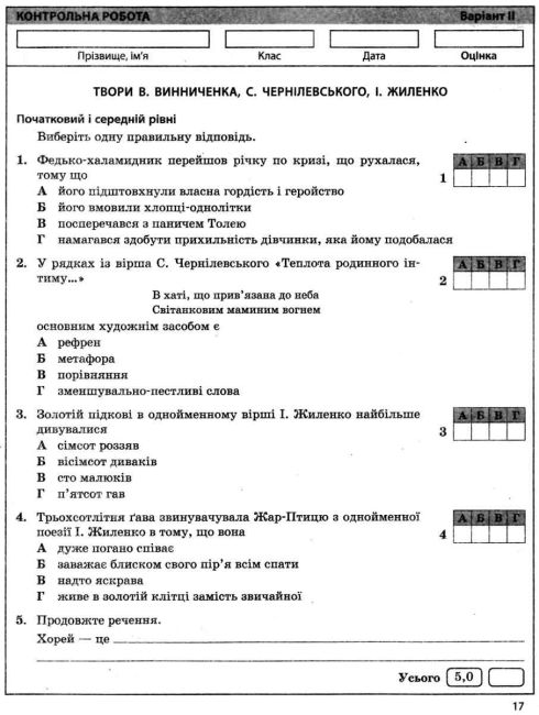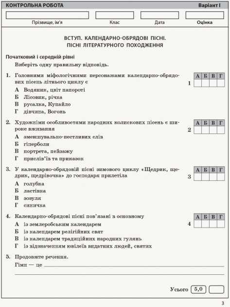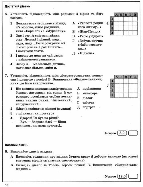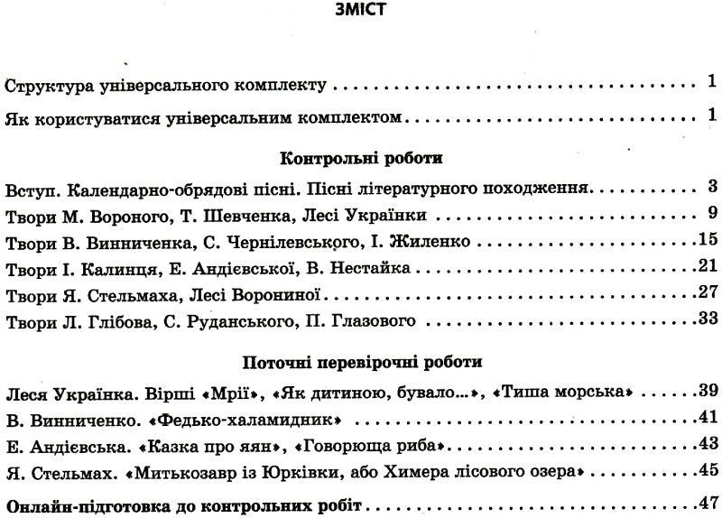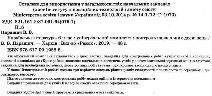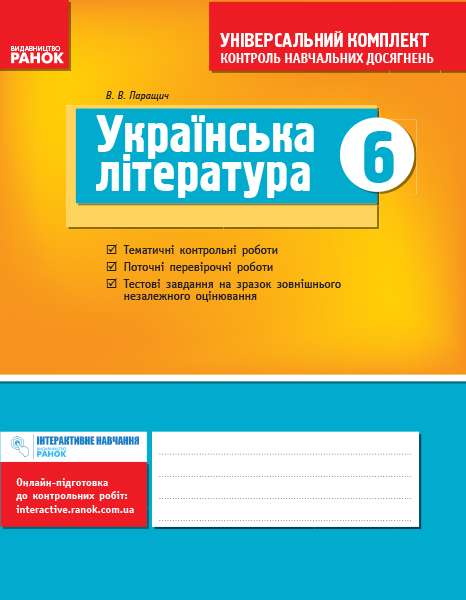 Контроль навчальних досягнень Українська література 6 клас Універсальний комплект Паращич В. Ранок. Універсальний комплект складається з двох частин: завдання для контрольних робіт з української літератури та тестові завдання для проведення поточних перевірочних робіт із теми, що охоплює твори одного письменника. У кожній контрольній роботі подано три варіанти завдань різних рівнів складності: початкового та середнього, достатнього, високого. Зміст завдань дозволяє використовувати посібник у комплекті з будь-яким чинним підручником.