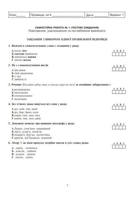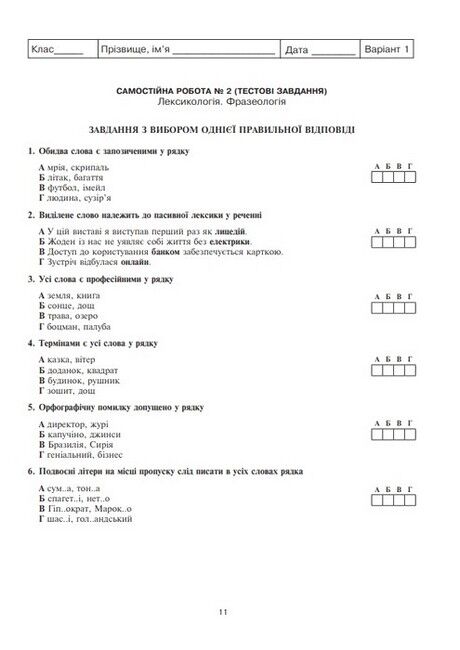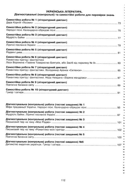 Пропонований посібник укладено відповідно до модельних навчальних програм «Українська мова. 5–6 кл.» (автори: Заболотний О. В. та ін.) та «Українська література. 5–6 кл.» (автори: Яценко Т. О. та ін.) для закладів загальної середньої освіти з української мови та літератури. Він містить по два варіанти контрольних та самостійних робіт до кожної теми 6 класу, які може використати вчитель при проведенні перевірки навчальних досягнень учнів. Для вчителів-філологів, учнів та студентів педагогічних закладів освіти.
