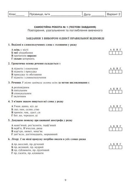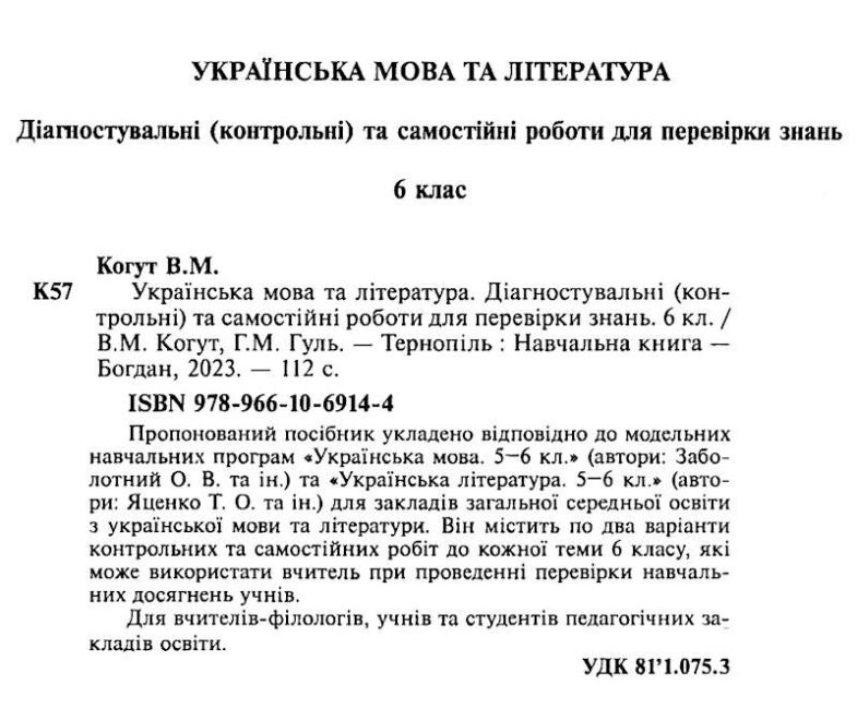 Діагностувальні (контрольні) та самостійні роботи для перевірки знань Українська мова та література 6 клас НУШ Авт: В.М. Когут Г.М. Гуль Вид-во: Богдан 90833