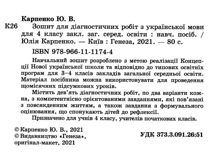 Українська мова 4 клас Зошит для діагностичних робіт НУШ Нова українська школа Карпенко Ю. Генеза