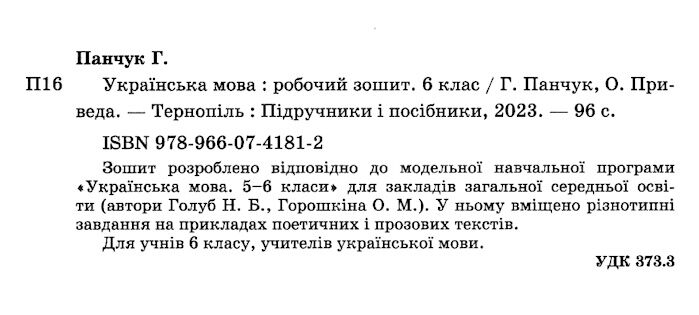 Робочий зошит Українська мова 6 клас НУШ За програмою Н.Б. Голуб О.М. Горошкіної Авт: Г. Панчук О. Приведа Вид-во: Підручники і посібники 90577