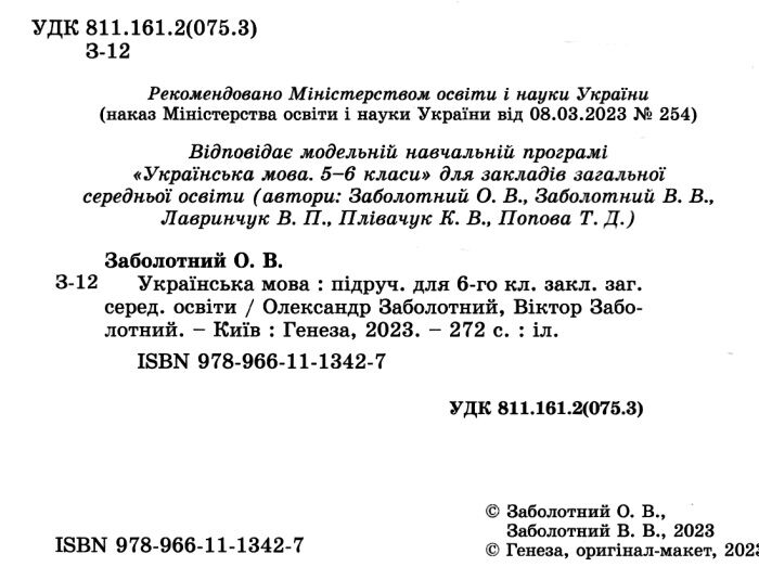Підручник Українська мова 6 клас НУШ Авт: В.В. Заболотний, О.В. Заболотний Вид-во: Генеза 94121