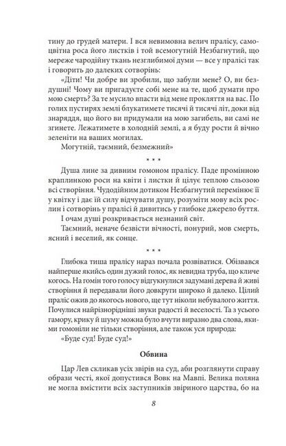 «Дума пралісу» — алегорична повість з філософськими роздумами. …У пралісі Лев скликав звірів на суд: Вовк образив Мавпу, назвавши її людиною. Чи винен Вовк? Розглядом цієї справи автор, свідок жахів світової війни, ніби пропонує людям — не вбивайте собі подібних задля розваги та збагачення й закликає: «Сину! Жий для Духа буття і для всіх сотворінь!»