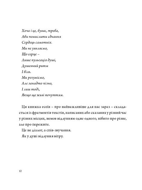 «Відлуння вітру» – це книга-прослуховування, книга-роздуми, книга-відчуття. Написана у формі фрагментованих есеїв і діалогів, вона не має лінійного сюжету, проте створює внутрішній простір зустрічі – з собою, із часом, зі світом, що змінюється на наших очах. Автори, філософ і мислитель Володимир Нікітін (Африканич) та інтелектуалка і фасилітаторка Інесса Кравченко, говорять про трансформації людства у добу сингулярності, втрату й пошук сенсів, тонкість душевного досвіду, про свободу, любов, духовну причетність і невидиму нитку, що пов’язує людину з живим світом. Це книжка для тих, хто чує тремтіння вітру, пісню птаха, шепіт змін. Для тих, хто хоче не просто жити – а бути в контакті з тишею, глибиною, собою. І в той самий час – з іншими.