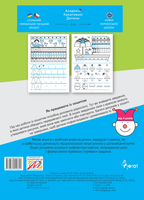 Мала школа Вчимося писати 4 Мандрівець. Метою зошита є всебічний розвиток дитини, передусім її навичок, які в майбутньому допоможуть першокласникові легше влитися у шкільний ритм життя.