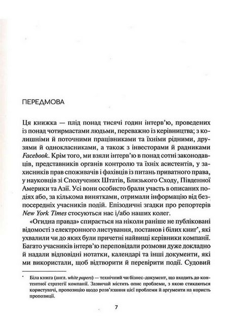 Більшість із нас зараз у Facebook. Гортаємо стрічку новин. Лайк, репост, коментар. Ми довіряємо соцмережі свої фото, лишаємо в «біо» особисті дані, номери телефонів. Адже Facebook запевняє: «Усе ОК, конфіденційність гарантовано!». І ігнорує торгівлю людьми, ширить неймовірну кількість шокового контенту, а топменеджер цієї найпопулярнішої соцмережі домовляється про щось протиправне з комуністичною владою В’єтнаму… Аж ось огидна правда пнеться з кабінетів на ток-шоу, несеться шпальтами світових ЗМІ. Стрімке та болісне падіння Facebook, приховані судові процеси, альянси й суперництво всередині корпорації зла, політичний вплив, сутички з Федеральною торговою комісією — Шіра Френкель і Сесілія Кан поведуть вас таємними стежками зітканого з брехні метасвіту Facebook…