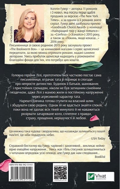 Головна героїня Лілі, прототипом якої частково постає сама авторка,втрачає тата й знову поринає в спогади про непросте дитинство. Будинок її батьків, шанованих і пристойних громадян, ніколи не був затишним сімейним гніздечком, адже Лілі з мамою жили в постійному напруженні через агресивний характер тата. Нарешті дівчина готова ступити на власний шлях і збудувати свою родину. Однак їй не вдасться знайти спокій,поки вона не здолає всіх тіней минулого й не наважиться розірвати зачароване коло, сплетене з правди, страху, прощення, нерішучості й любові.- ISBN9789669425140