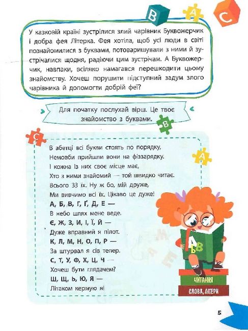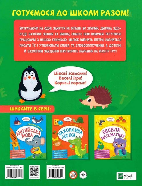 Витрачаючи на одне заняття не більше 20 хвилин, дитина здобуде важливі знання та вміння, опанує нові навички. Регулярно працюючи з нашою книжкою, малюк вивчить літери, навчиться писати їх і утворювати слова та словосполучення. А дотепні й захопливі завдання перетворять навчання на веселу гру!