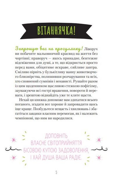Запрошую вас на прогулянку! Ліворуч ви побачите мальовничий краєвид на життя без чортівні; праворуч — якесь принадне, бентежне відсвіження для душі, а те, що відкриється просто перед вами, обіцятиме яскраве, сяйливе завтра. Сміливо пірніть у булькітливу ванну животворчого блюзнірства, полишивши розчарування та всіх, хто сповнений сумнівів і ненависті. Рушайте разом із цим щоденником щасливою стежкою пофігізму, зауважуючи всі гострі враження, повороти й переваги, і зрештою віднайдіть уже те кляте щастя.