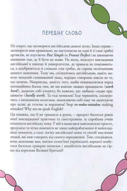 Книжка досвідченого перекладача та викладача англійської мови Сергія Святенка допоможе всім, хто має намір писати і спілкуватись англійською правильно. Автор максимально просто, зрозуміло та чітко пояснює не лише найпроблемніші і найскладніші моменти в англійській, а й саму логіку цієї мови та спосіб мислення людей, які нею говорять від самого народження.