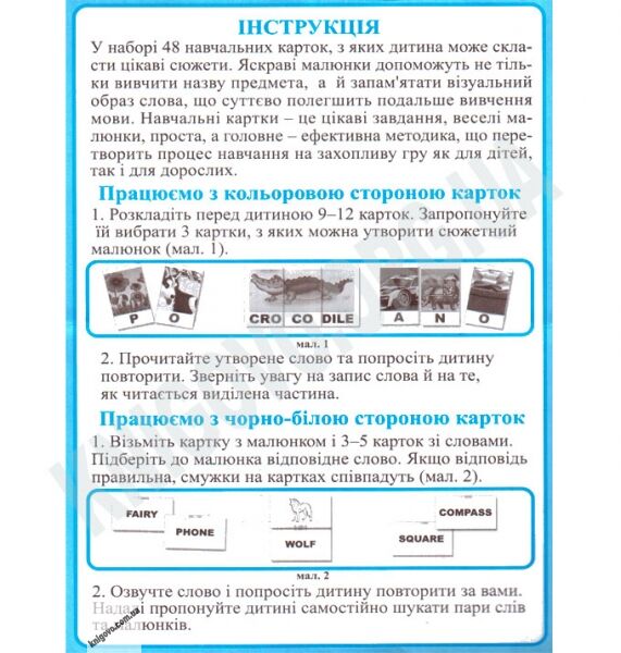 У наборі 48 навчальних карток, з яких дитина може скласти цікаві сюжети. Яскраві малюнки допоможуть не тільки вивчити назву предмета, а й запам’ятати візуальний образ слова, що суттєво полегшить подальше вивчення мови. Навчальні картки - це цікаві завдання, веселі малюнки, проста, а головне - ефективна методика, що перетворить процес навчання на захопливу гру як для дітей, так і для дорослих.