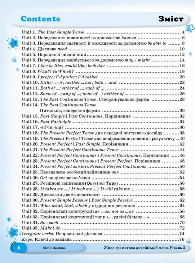 Весь матеріал книги розділений на 35 тем, кожна з яких пояснюється простою і зрозумілою мовою. Теорія обов'язково закріплюється практикою. Прості завдання допоможуть перевірити, наскільки добре засвоєний матеріал теми, а для виконання більш складних завдань знадобляться знання пройденого раніше матеріалу. Жива граматика англійської мови 3 рівня навчить вас правильно висловлювати свої думки англійською мовою, а у дітей не буде проблем з написанням контрольних робіт у школі та складанням іспитів і тестів з англійської.