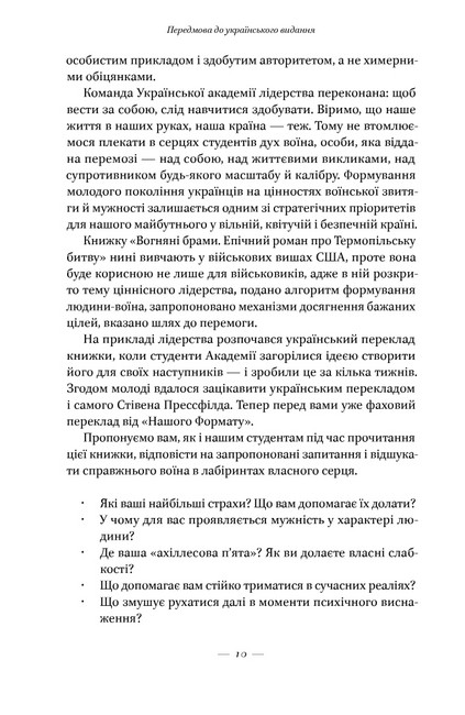 Битва під Термопілами – один із найвідоміших прикладів хоробрості, а «Вогняні брами» – один із найкращих мілітарних романів не лише про цей історичний епізод, але й про війну загалом. Про війну як вона є. Криваву, брутальну, нещадну і брудну війну, в якій дивом залишається місце для людськості, а те, що ми бачимо як героїзм, перефразовуючи слова одного з персонажів роману, – лише робота, яку треба зробити добре.