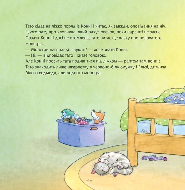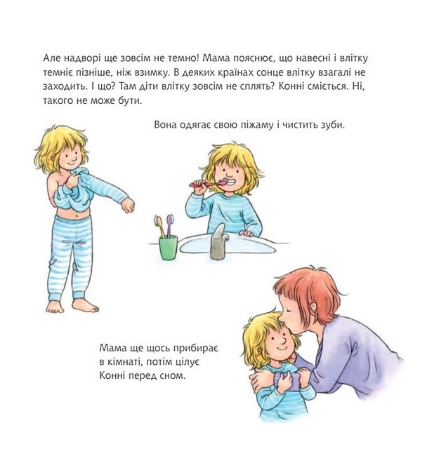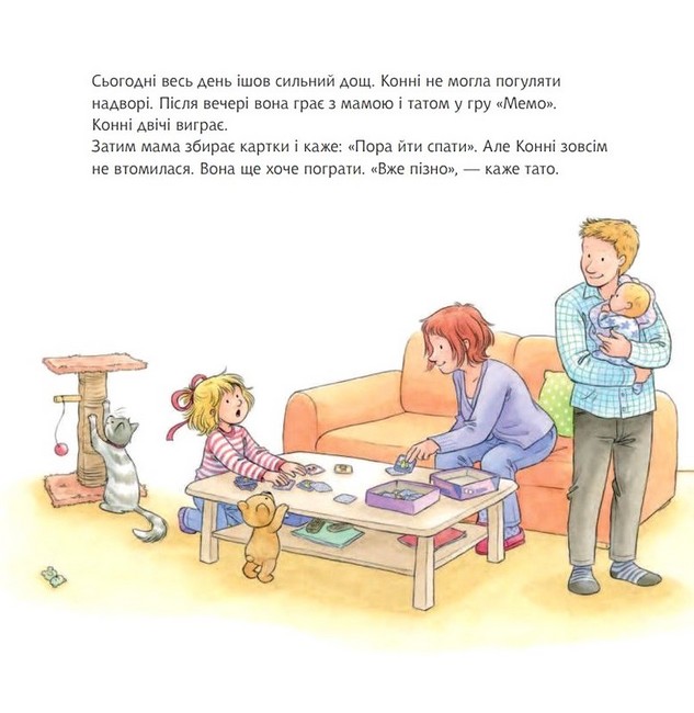 «Пора спати», — кажуть мама і тато. Але Конні не може заснути. Вона зовсім не втомилася! Якоб також ще не спить, а він набагато менший від неї. І тато, і мама ще не сплять... Але, нарешті, Конні вдається заснути.