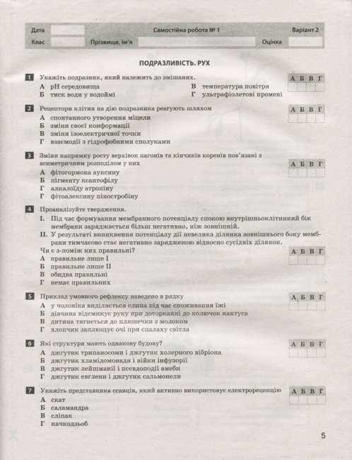 Тестовий контроль результатів навчання Біологія і Екологія 11 клас Профільний рівень. Зміст: Самостійні роботи, Подразливість. Рух, Саморегуляція. Адаптації, Біологічні основи здорового способу життя, Селекція та біотехнологія, Сталий розвиток та збалансоване природокористування. Контрольна робота, Тренувальні тести для самооцінювання, Список використаних джерел та інш.