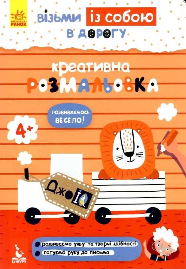 ДжоIQ Візьми із собою в дорогу Креативна розмальовка Кенгуру 4+ Ранок. Яскраві книжки зручного формату із цікавими завданнями, що стануть у пригоді під час підготовки до школи: у дорозі, в гостях чи вдома. Допоможуть зацікавити малюка, заохотити його до самостійних занять; розвинути моторику, сформувати навички акуратності, посидючості, підготувати руку до письма.