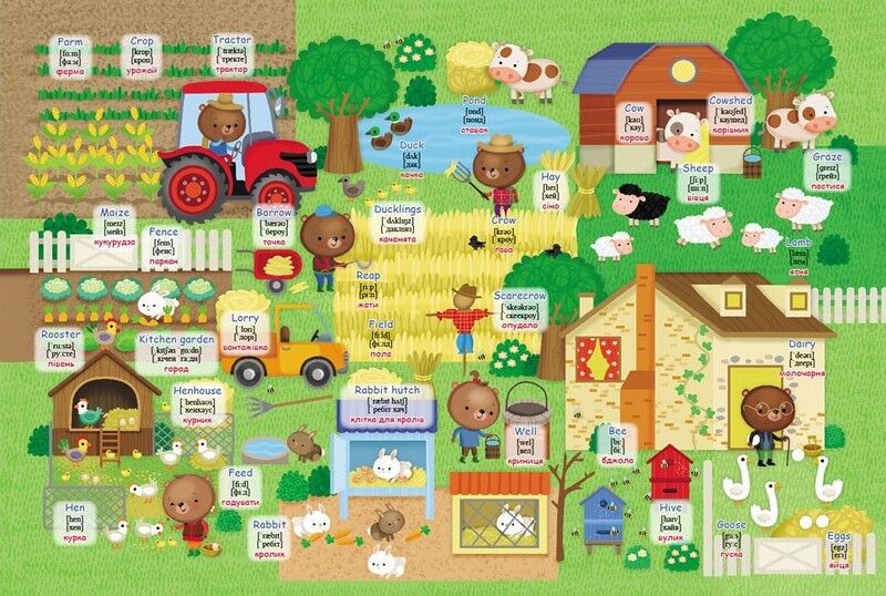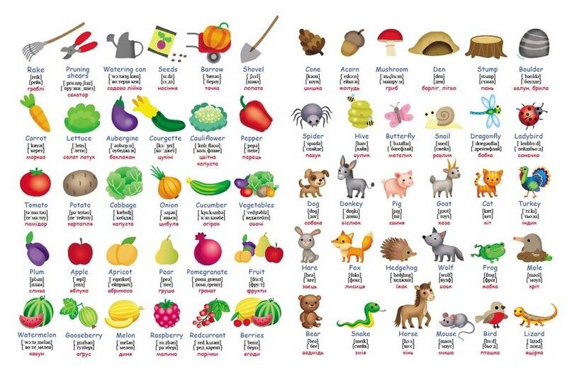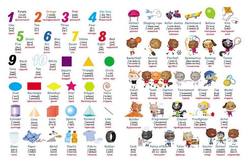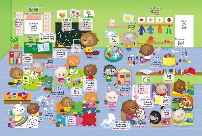 До вашої уваги пропонується дитячий словник, у якому проілюстровано понад 300 слів із перекладом за 12 темами: