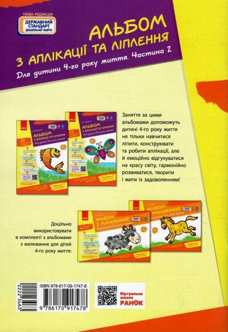 Альбом з аплікації та ліплення для дитини 4-го року життя Частина 2 Зима Літо містить 20 тематичних занять, розроблених відповідно до вимог Базового компоненту дошкільної освіти.