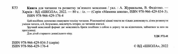 "Маміна школа" - це чарівна книга, яка стане ідеальним компаньйоном для дітей віком від 4 до 6 років у їхньому першому кроці у світі читання та мовлення. Автор В. Федієнко створив цю книгу з метою зацікавити та підтримати дитячий інтерес до мовлення і слова.