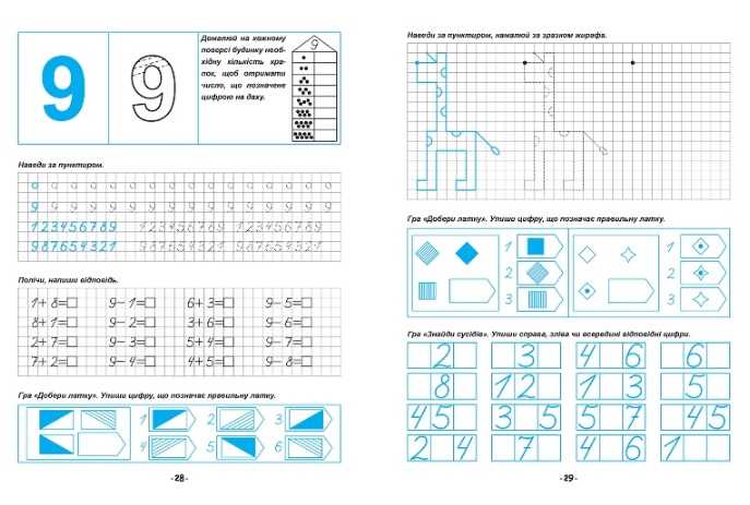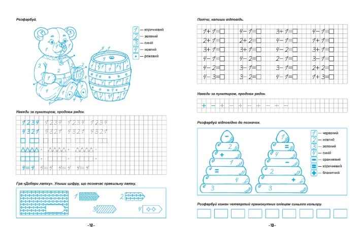 За допомогою цікавих вправ майбутній першокласник набуде навичок правильного написання цифр, зображення геометричних фігур. Завдання в ігровій формі допоможуть розвинути зорову пам'ять та увагу.
