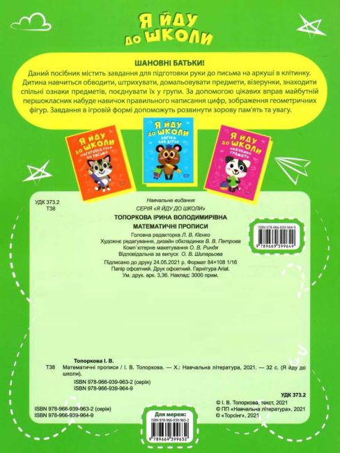 "Я Йду до школи: Математичні прописи" від Топоркова І. та Торсінга - це інноваційний зошит, спеціально розроблений для молодших школярів з метою покращення навичок у математиці перед вступом до школи.