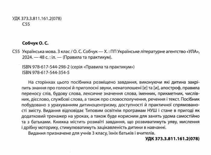 Правила та практикум Українська мова 3 клас НУШ Авт: Собчук О.С. Вид-во: УЛА 101722