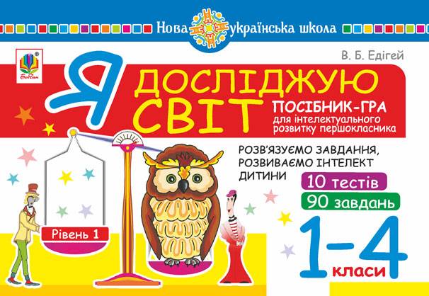 Я досліджую світ 1-4 класи Рівень 1 Посібник-гра для інтелектуального розвитку школяра 10 тестів 90 завдань НУШ. У посібнику вміщені 90 завдань, які складають 1-й рівень складності й призначені для інтелектуального розвитку молодших школярів. Завдання розподілені на 10 тестів, у кожному з яких є по 9 завдань, при цьому наприкінці посібника подаються відповіді до завдань кожного тесту, а також таблиця для оцінювання самим школярем свого інтелектуального рівня.