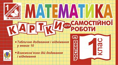 У посібнику подано картки з математики для поточного та тематичного контролю знань учнів 1 класу з усіх тем нової програми. Посібник призначений для самостійної роботи учнів.