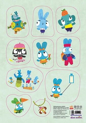 Стікерпаки з героями мультсеріалу «Хоробрі Зайці» складаються з 2 аркушів наліпок формату А5 у пакеті. Наліпками можна прикрасити ноутбук, смартфон, планшет, все на що вистачить фантазії. Кожен стікер на аркуші вирізаний по контуру, його легко відокремити від аркуша.
