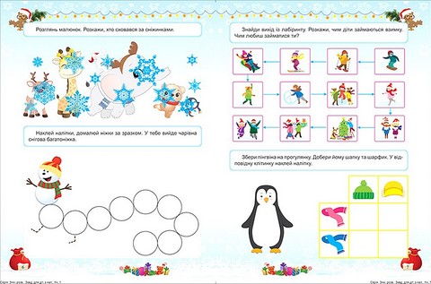 Дана книга є найкращим помічником у створенні неймовірної зимової атмосфери, надаючи можливість батькам або педагогам весело та корисно провести час із малечею. Виконання завдань із наліпками допоможе розвинути в дитини дрібну моторику, мовлення, кмітливість, опанувати навички лічби і письма, навчитися спостерігати, уявляти та самостійно працювати.